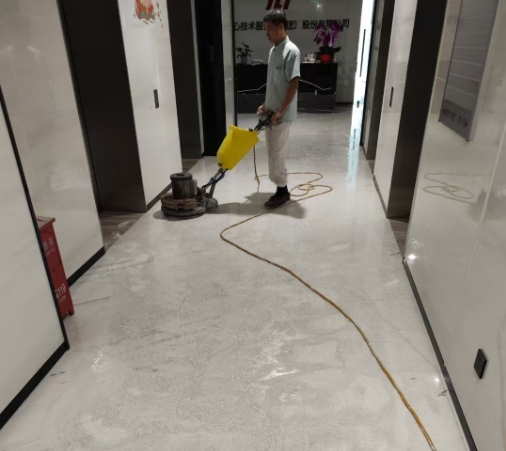 3、 拋光: 研磨完畢后使用專用拋光設(shè)備及拋光材料對(duì)地板進(jìn)行整體的拋磨,使石材更顯光亮。